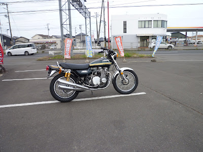 大きな個性的な車体がたくさん並ぶ店内で圧倒されながら見て楽しみ、胸いっぱいで店を出た。駐車場に一台のKAWASAKIが止まっていた。