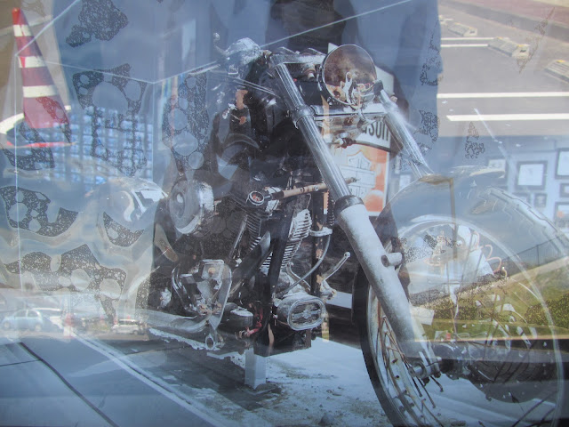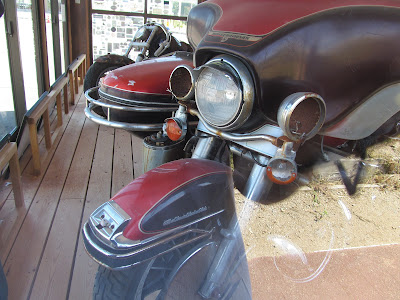 地元で被災したハーレー2台がひっそりと、産直市場の駐車場の片隅の小さな小屋に眠っている。ガラスに光が反射して中が見えにくい。写真を撮って、その場を後にした。