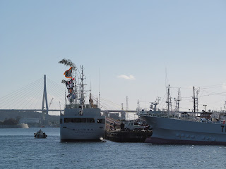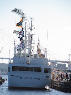 赤い欄干のある場所に着くと、漁船の出航合図が聞こえてきた。マグロ船だろうか、見送りの人々と船がテープで繋がっている光景を生で見たのは初めてだ。派手な音楽を流し、汽笛を響かせて船はゆっくりと出航していった。