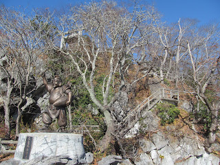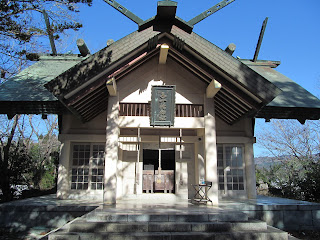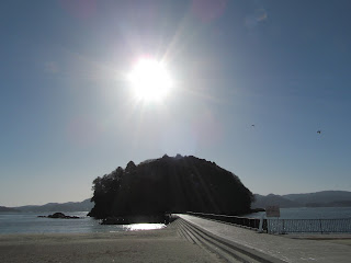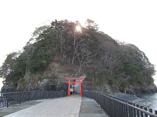 海沿いの道を海水浴場に沿って走り、荒島に立ち寄り、島のてっぺんの神社を詣る。