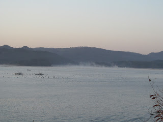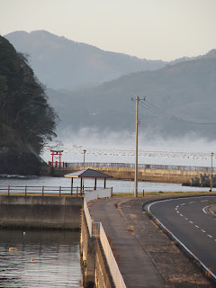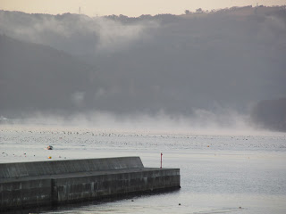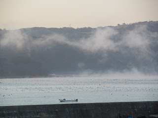 袖浜漁港の岸壁へ戻ると、対岸の気嵐が見えていた。暖かい日が続き、期待していなかっただけに感動した。冷えた朝の、日の出から1時間程度しか見られない現象だそうだ。